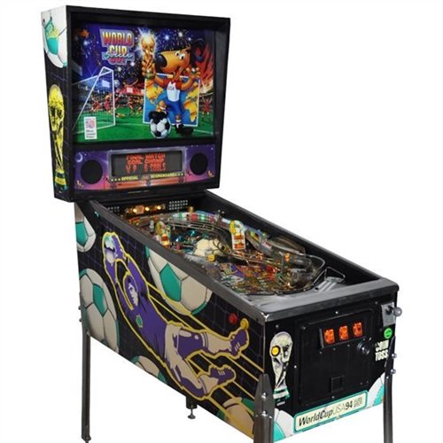 Based on the 1994 World Cup in the USA, this pinball game is all-action football fun. With a large rotating soccer ball on the playfield, several rollover targets, a goal complete with moving goalkeeper, and excellent dot matrix animation and audio, this is pinball for football lovers!